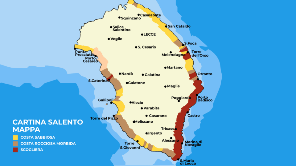 Iniziamo presentando il Salento, un territorio nel Sud della Puglia, bagnato da due mari: a occidente il Mar Ionio, caratterizzato da lunghe spiagge; a oriente il Mar Adriatico che invece presenta una costa più rocciosa. L’area della Puglia chiamata Salento comprende la provincia di Lecce, parte della provincia di Brindisi e di quella di Taranto.